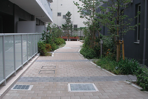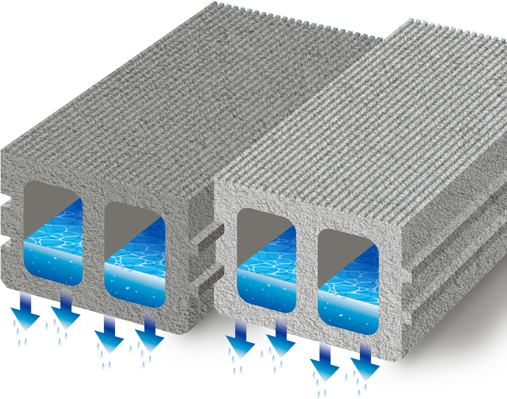 ブロック全体の微細な空隙(ポーラス構造)は表面から雨水を透水させるだけでなく、空洞部に溜まった水をゆっくりとブロックの底面から地盤へ浸み込ませます。この時間差が排水施設への負荷を低減し豪雨の際に溢れる水を抑えることに繋がります。